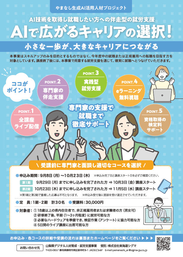 山梨県と株式会社東海道シグマで実施する同事業の就労支援を協同で実施します。 AI技術を学んだ人材と紹介を希望する企業のマッチングを実施します。 詳しくは山梨県HPへ…